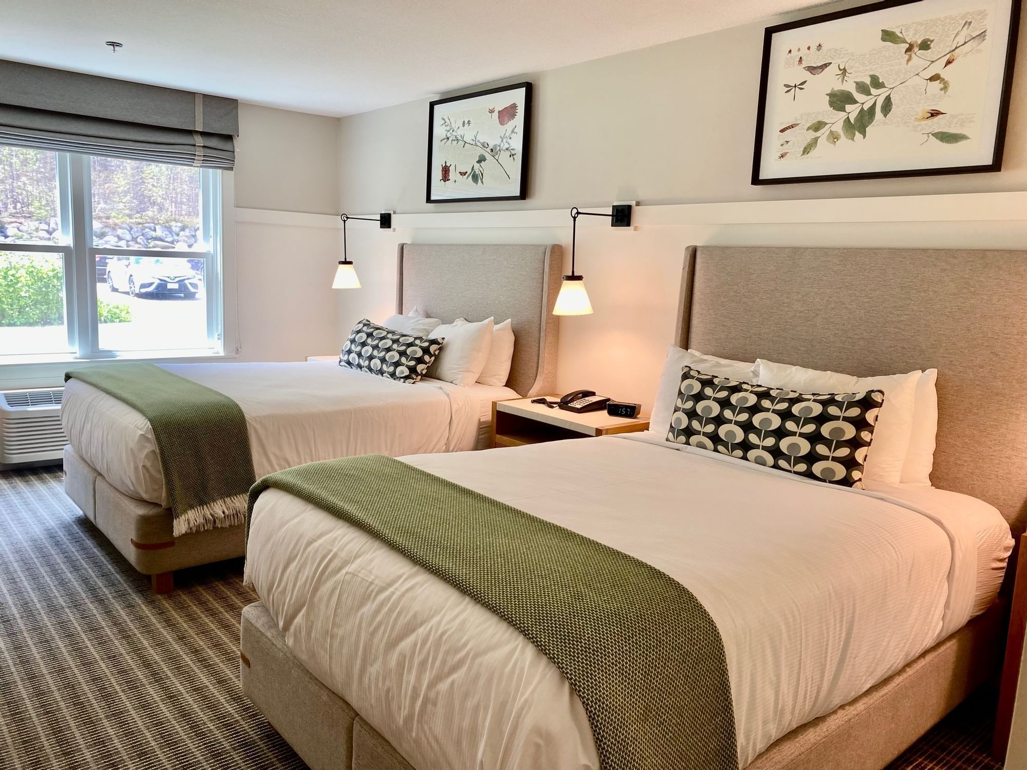 Full breakfast included. 300 sq. ft. featuring two double beds with Serta pillow-top mattress, high-thread-count linens, Anichini throw blankets, plush robe and slippers, flat-screen TV, digital alarm clock, high-speed wireless internet, multiple USB ports, in-room HVAC controls and refrigerator. Modern bathrooms offer a tub/shower combo, Speakman rain shower with handheld, eco-friendly Aveda amenities, make-up mirror and spa hairdryer. Access to 24-hour guest beverage pantry. Limited Dog-friendly rooms available, call to book in advance.